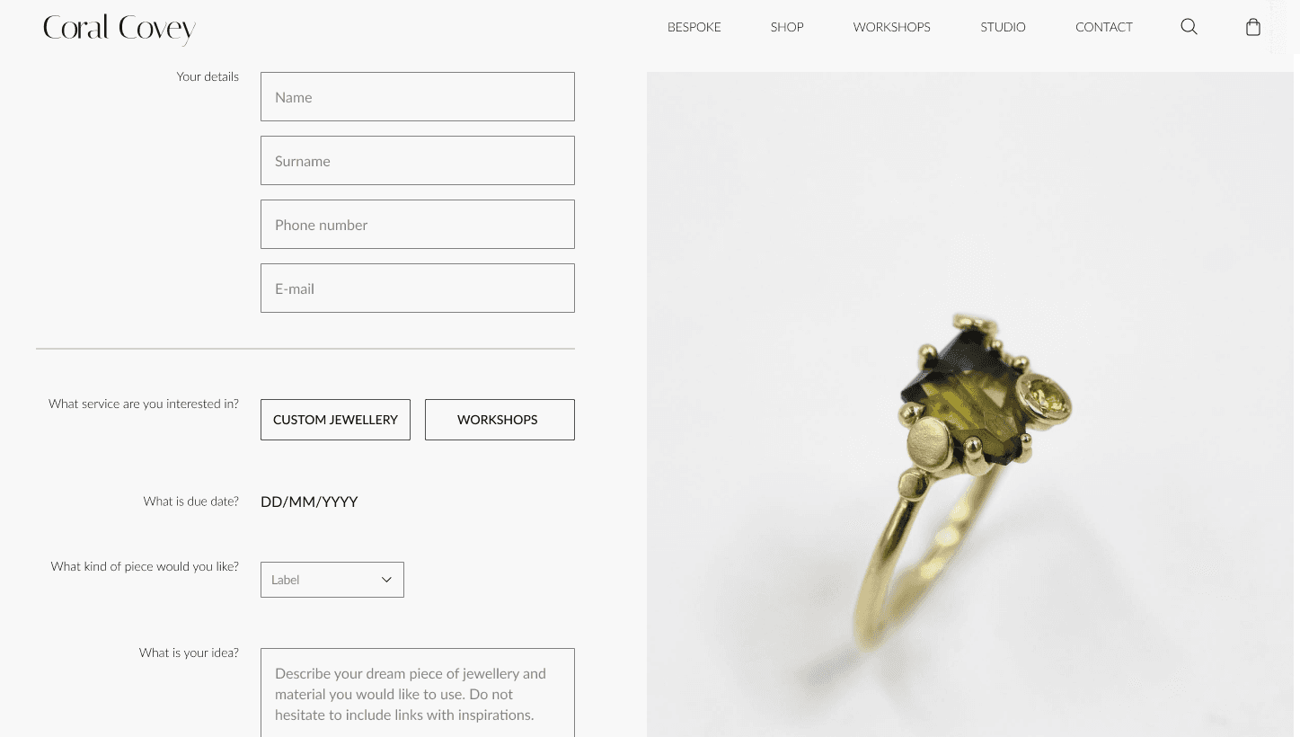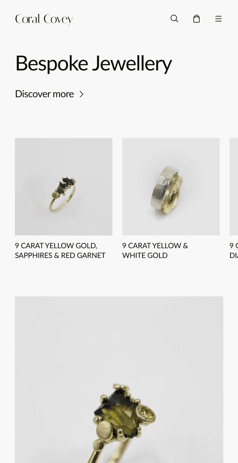 This project was completed as part of the Digital Designer web design course by Tom Biskup and Design Practice. I worked on the website redesign of Coral Covey, an Australian jewelry brand founded by Laura Deakin. She creates custom-made, uniquely artistic jewelry with a strong focus on ethical practices, sustainability, and timeless design.